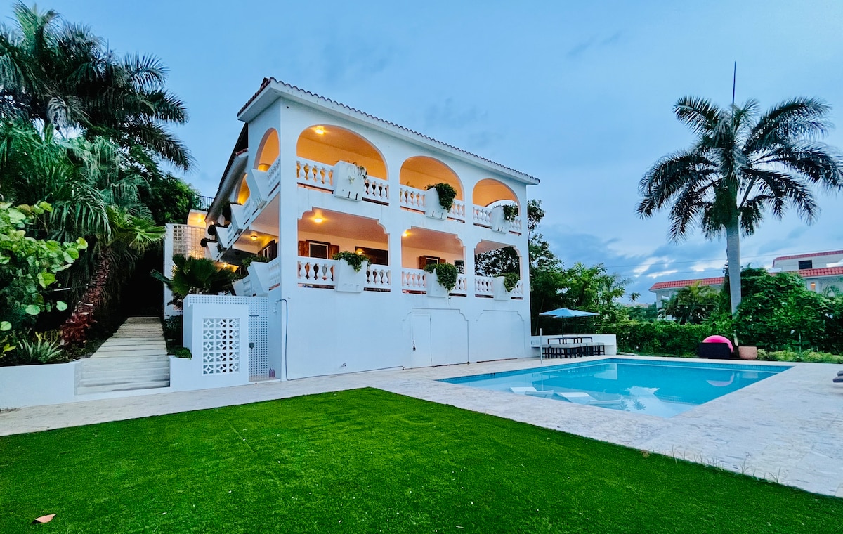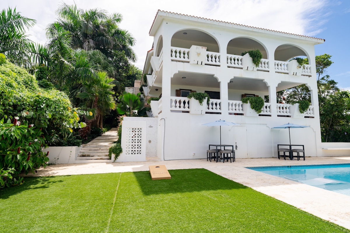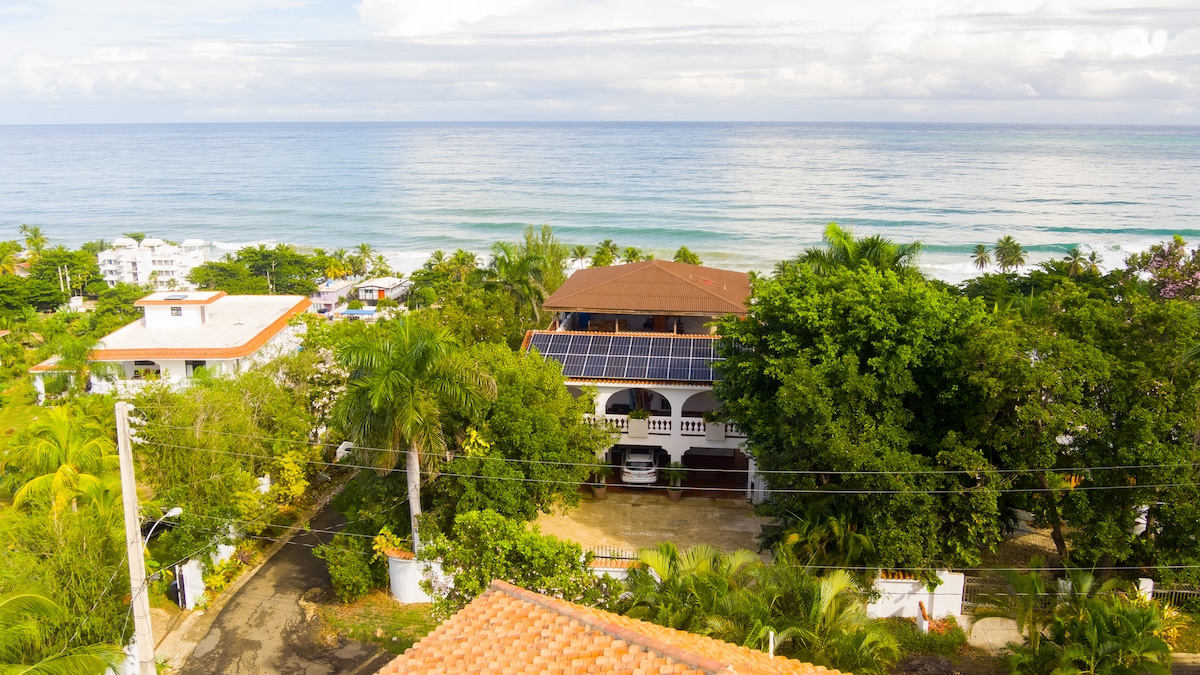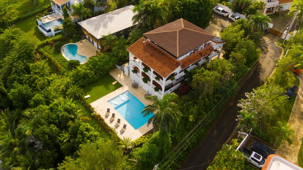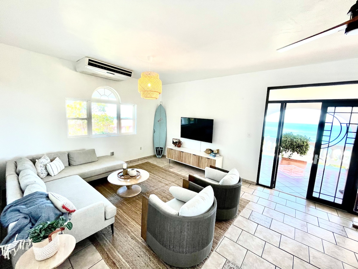 Perfect for large groups with 2 separate apartments and an amazing private pool. Enjoy a stylish experience at this centrally-located villa with privacy and 270 degree ocean views from all four levels, pool to rooftop. Large covered terraces allow contemplation of the ocean on all weather, and the large pool means you never have to go anywhere for fun. The beach is just a short 2 block walk so you can glow back and forth with ease.